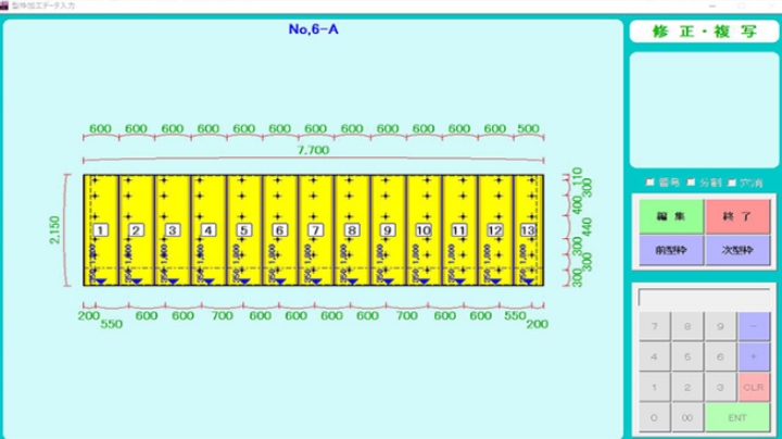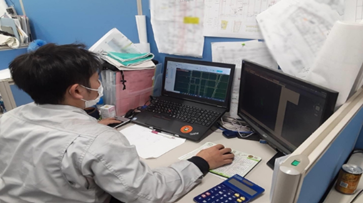 パソコンを使って、柱、壁、梁、スラブ等の形状、寸法、数量等を計算し、加工図を作ります。