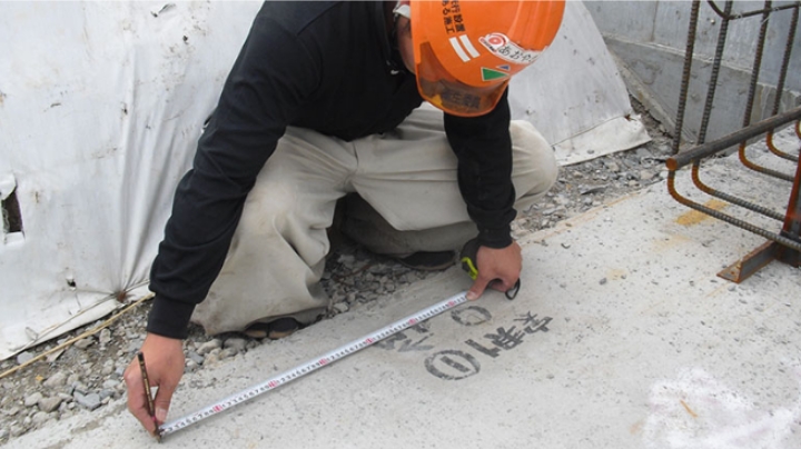 施工図面により現場で型枠を組立てる柱、壁などの位置を床に線や印で表す作業です。